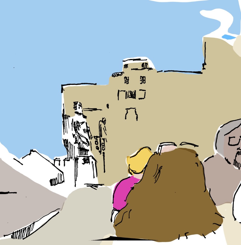 Breakfasting outside in the warm July weather on a bustling side street (and sketching the table behind us) before taking a tour of Castel Sant’Angelo at the Vatican.